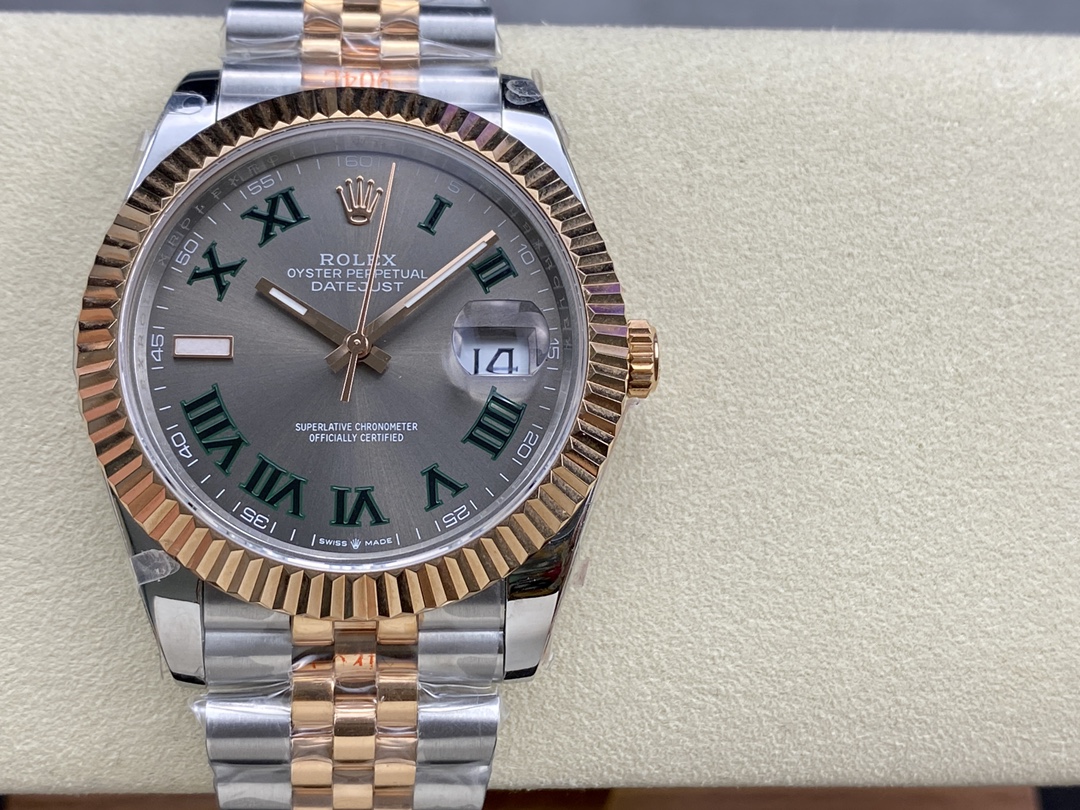 Experience the Rolex Datejust 41 Wimbledon Super Clone Ref. 126334. Fluted bezel, slate dial, and an exact Calibre 3235 movement. Unmatched quality.